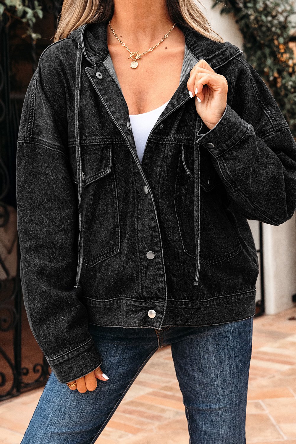 The jacket includes a drawstring hood and flap pockets for added functionality.
