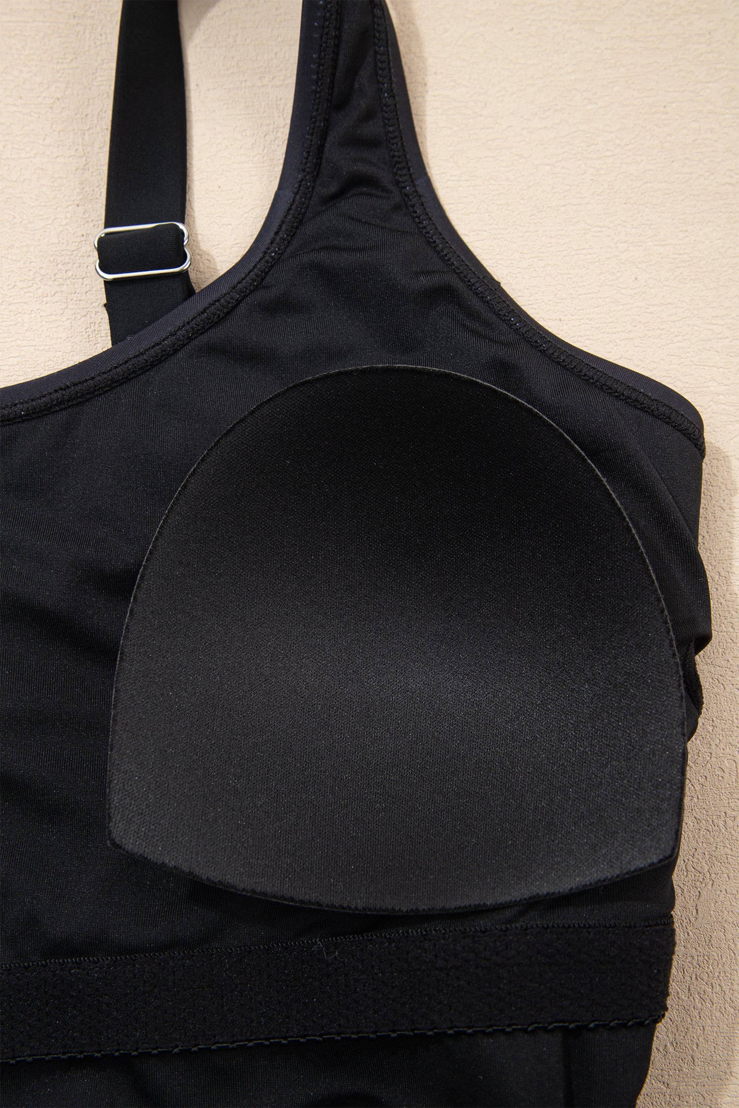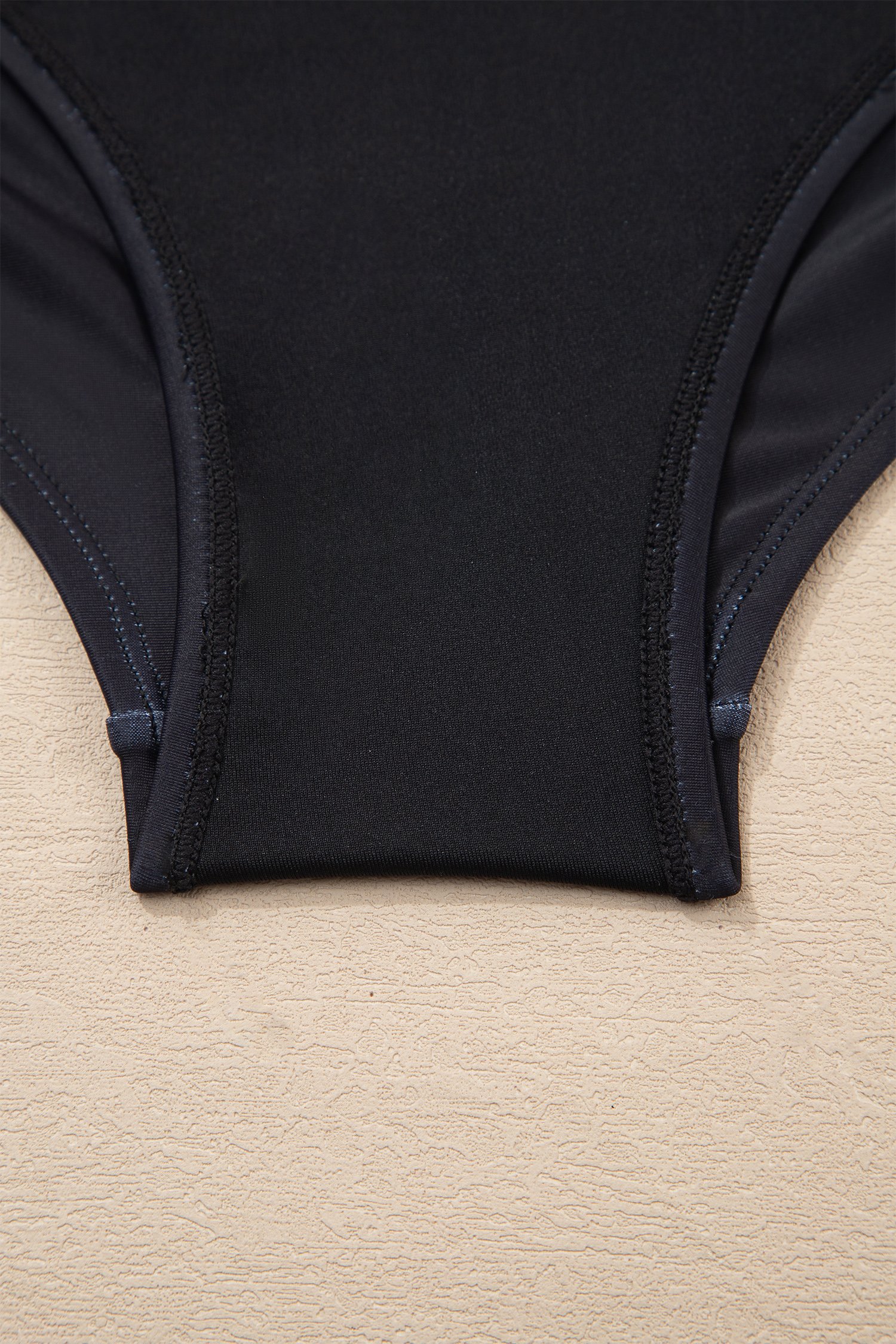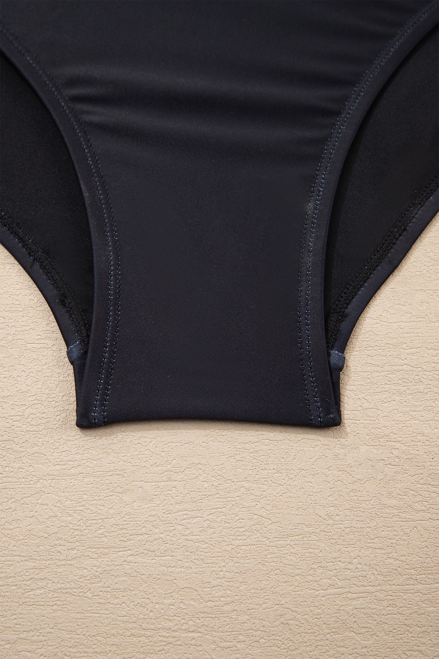 The one piece swimsuit is asymmetrical and has a delicate cutout.