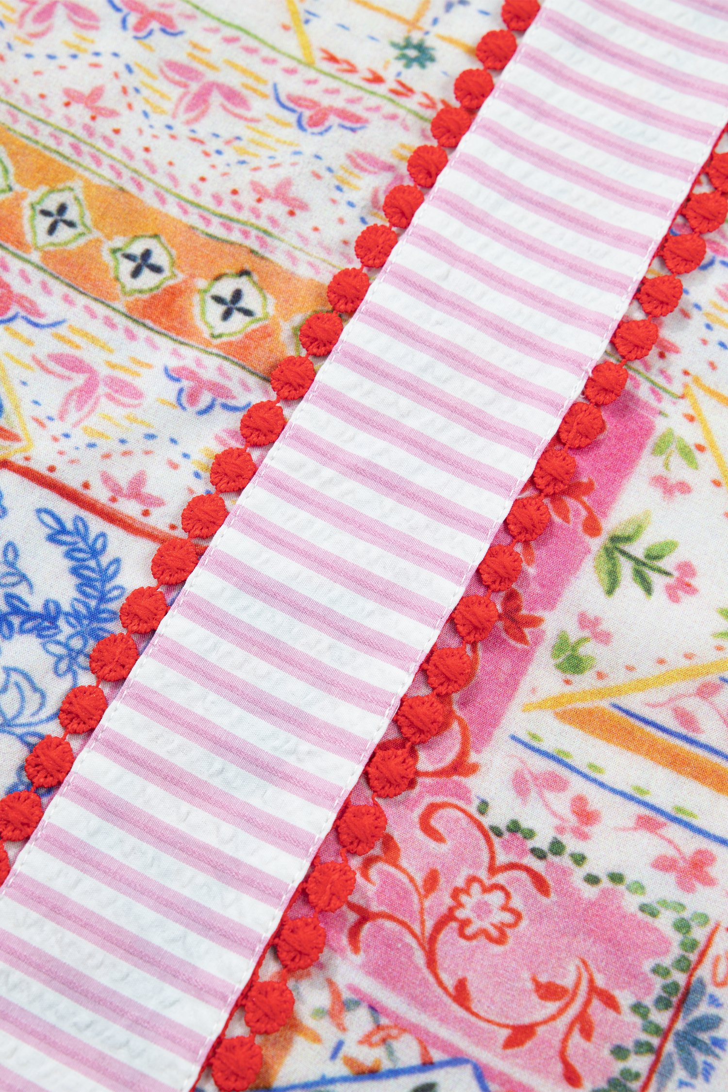The vibrant patchwork fabric features a pink stripe accent along the collar and front.